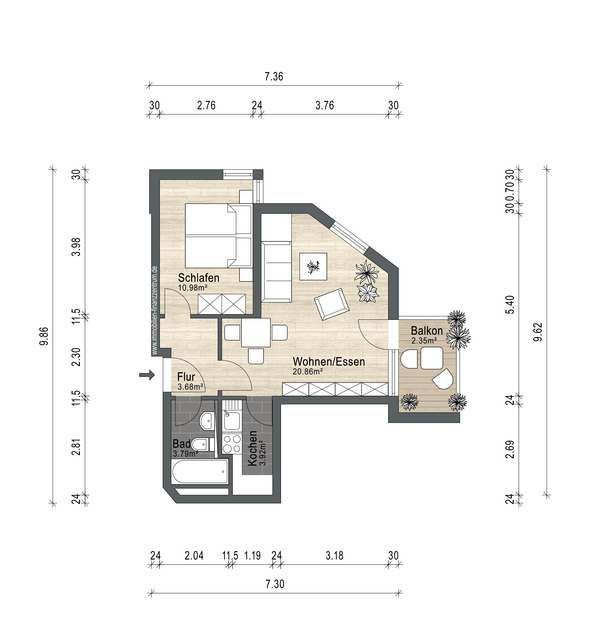 Die Wohnung überzeugt durch ihre helle und freundliche Gestaltung. Der Wohnbereich ist geräumig und bietet direkten Zugang zum Balkon, der zum Entspannen einlädt. Das Schlafzimmer ist ebenfalls lichtdurchflutet und bietet ausreichend Platz für ein Doppelbett sowie Stauraum.