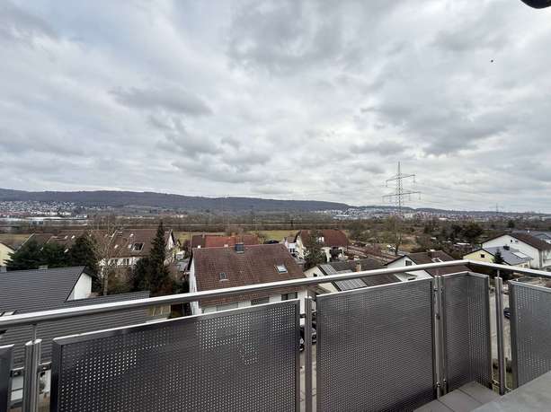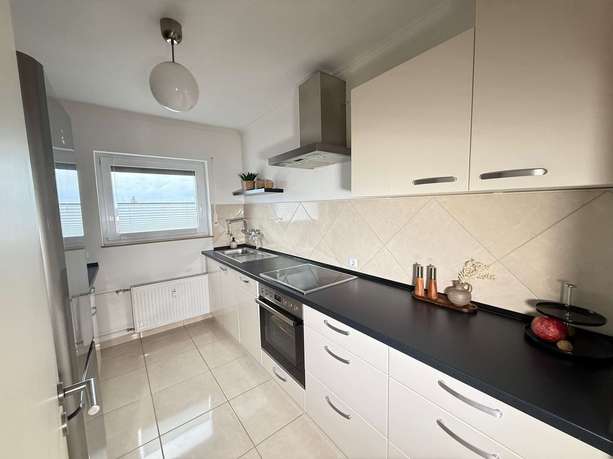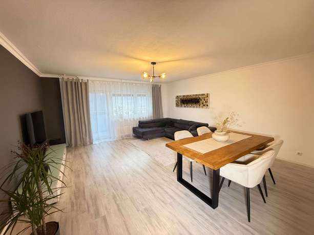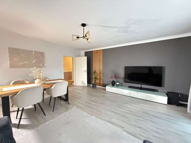 Das helle Wohnzimmer bietet Zugang zum Balkon, der mit einer Markise ausgestattet ist und zum Entspannen einlädt. Von hier aus genießen Sie einen freien und angenehmen Ausblick.