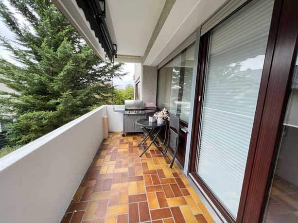 Der Balkon bietet viel Platz zum Entspannen und lockt zum Sonnen sowie zu einem gemütlich Grillabend ein.