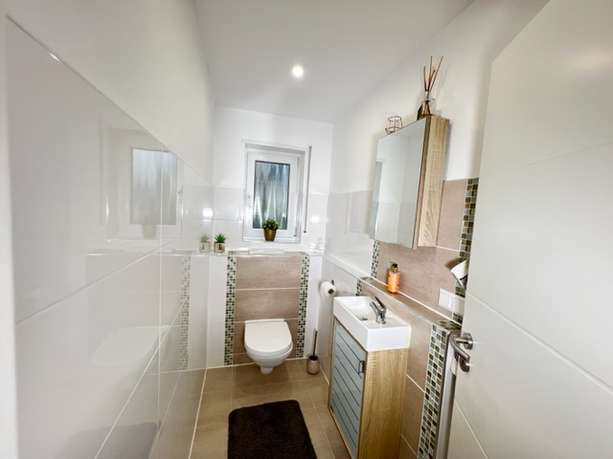 Sanitäre Anlagen: Hauptbad und Gäste-WC modern gefliest